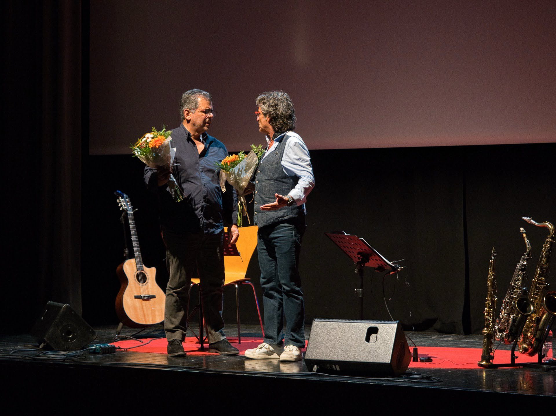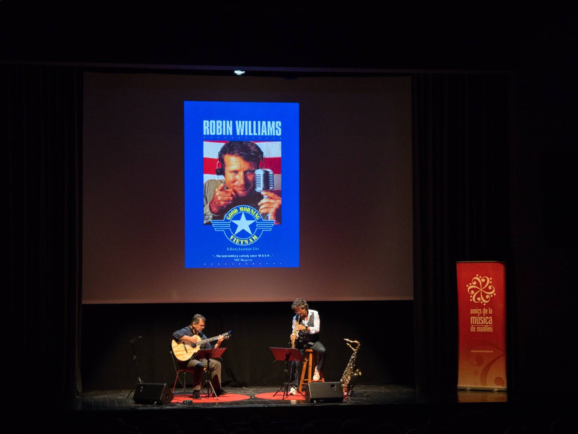 Amb un TEATRE MUNICIPAL de MANLLEU plè es va poder gaudir del primer "SAX, GUITAR & FILMS" amb el suport d'imatges de les pel·lícules.