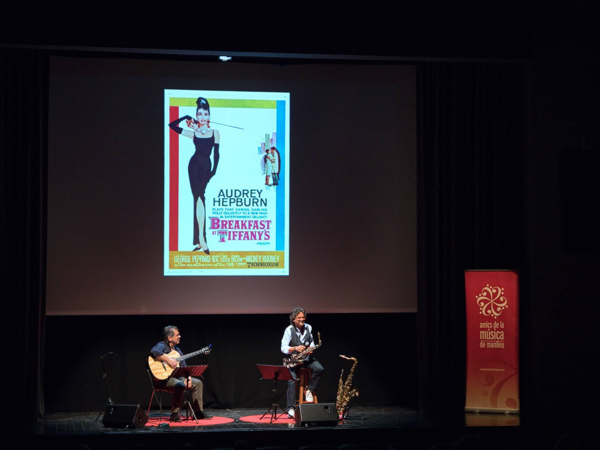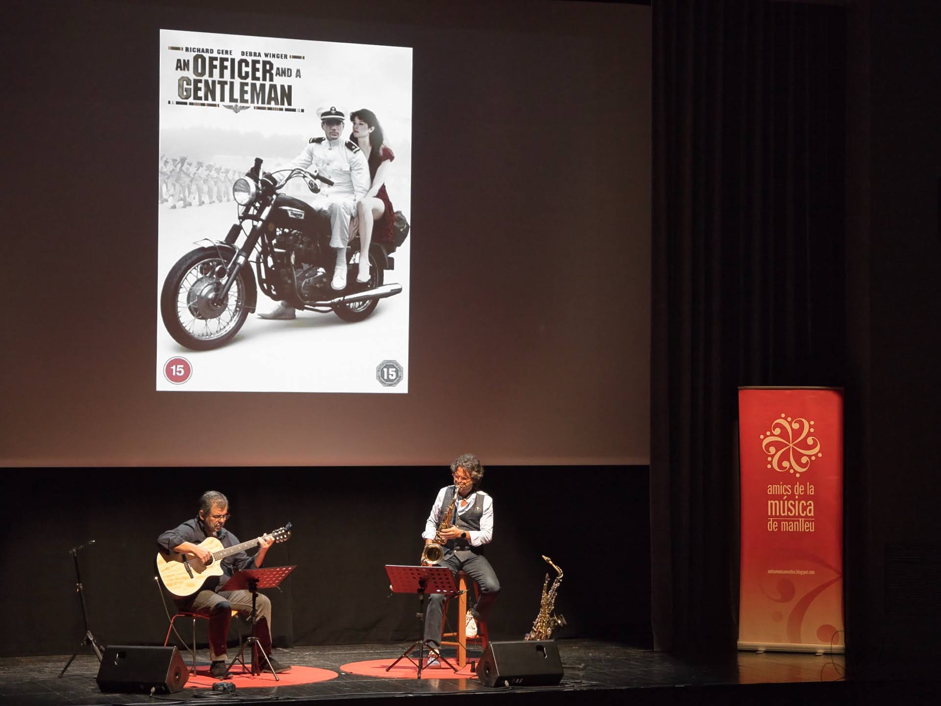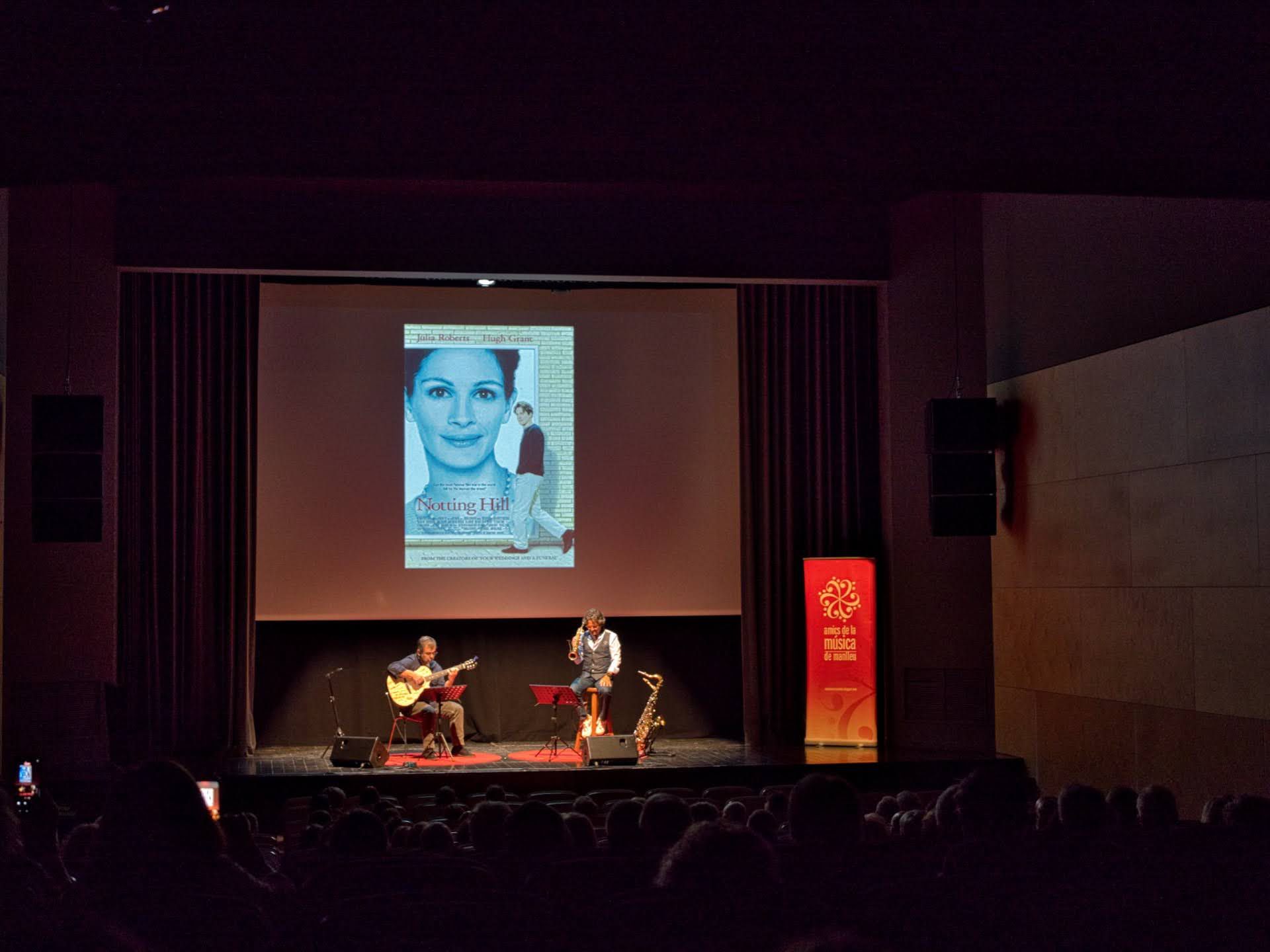 Amb un TEATRE MUNICIPAL de MANLLEU plè es va poder gaudir del primer "SAX, GUITAR & FILMS" amb el suport d'imatges de les pel·lícules.